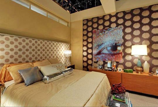 Remember I said that a over sized headboard makes a statement..well this is a great example..Looks like 2 sizes of plywood layered on top of each other with bronze studs bordering the smaller piece for definition. The bold fabric says it all. Love it!